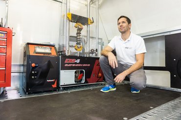 Mire idáig eljutottunk, már leolvadt az agyam a sok információtól, úgyhogy levezetésnek megnéztük a mobil futóműlabort - minden van itt, ami futóműszereléshez és diagnosztikához kellhet, a fenti képen például a diagnosztika pad látható: berakod a rugóstagot, rugó nélkül, elkezdi le-fel rángatni, és megnézi, hogy adott húzóerőből mi adódik át a másik oldalra, és ebből lehet következtetni nagyjából mindenre, pl. mekkora a csillapítás.
