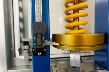 A másik fontos eszköz egy rugóerőmérő, ez egy tolómérő és egy nagyon precíz mérleg kombinációja, összenyomod 10 mm-t és megnézed, hogy milyen erő kell hozzá. A rugón ott van, hogy 115-ös, ami az Öhlins-nél azt jelenti, hogy egy centiméterre 115 kiló jut, vagy egy milliméterre 115 newton, ami 11,5 kiló - ezzel egyrészt ellenőrizni lehet, hogy a rugó tényleg azt tudja-e, ami rá van írva, vagy fel lehet mérni egy felirat nélküli rugót.