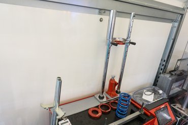 A rugóösszenyomó prés régi ismerős, rugócserénél elengedhetetlen, illetve mellette van egy szemtávolságmérő szerkezet, ezzel tudod megnézni a motor alap geometriáját, villaszög beállításnál elengedhetetlen. Egy komoly lengéscsillapítónál lehet állítani a magasságot - és ezzel lehet megnézni az alapbeállítást.