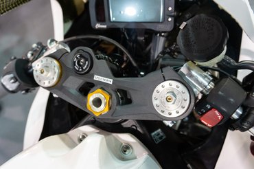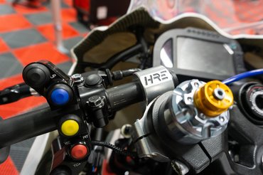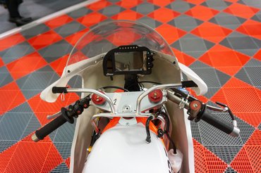 A műszerfal az I2M Pro verziója, ehhez tartoznak az aluházas kormánykapcsolók - ez a rendszer attól Pro, hogy már össze lehet tanítani kerékszelep wifis jeladójával (ezeknek a kódja van felmatricázva a hátsó kerékre), és onnantól a telemetria tudja, mennyi nyomás van a gumikban, és milyen meleg bennük a levegő.