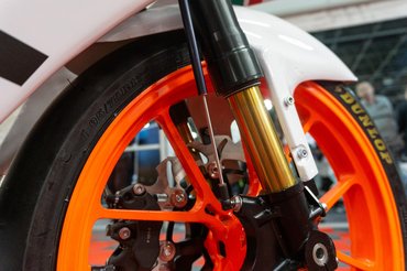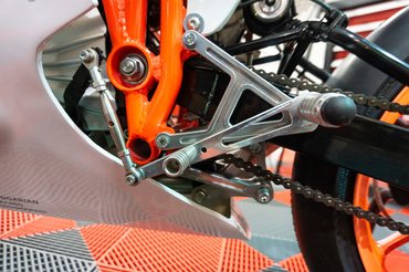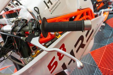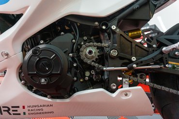 A hátsó féknél két cső van - az egyik a fékcső, a kék pedig egy nyomásmérőhöz megy, ami aztán továbbítja az adatot a műszerfalnak. Itt is a teljes telemetria a cél - az adatelemzés nagyon fontos a versenymérnöki oktatáshoz, a MotoGP-ben is minden pilótának külön telemetriás embere van, ami egy nagyon fontos és megbecsült pozíció a csapaton belül, neki kell ugyanis átlátnia és értelmeznie az adatokat, konzultálnia a versenyzővel, levonni a konklúziót és meghozni a döntést, hogy mit és merre kell állítani. És aki ezt tényleg tudja, az kincset ér. Általánosságban elmondható, hogy egy modern versenymotor rendkívül komplex rendszer, csak hogy egy példát mondjak, kanyarról kanyarra lehet beállításokat megadni az elektronikának, de például egy MotoGP motor váltójához egy külön oda rendelt mérnökre van szükség, aki semmi mással nem foglalkozik - tehát sok, egyenként is nagyon bonyolult részterület van, amik ráadásul elég nagy hatással vannak egymásra.
