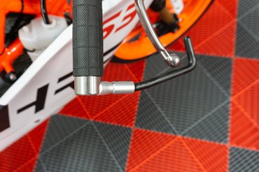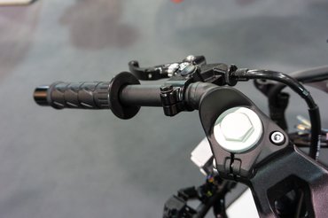 A MAMI-nak jelenleg 10 ilyen MIR-je van, és mivel csak másfél hete vették át őket, első körben csak a kormánycsövet alakították át. Az egy henger miatt erős a vibráció - ne feledjük, ez versenymotor, míg az utcai CBF250 elég kényelmes, ennél ez egyáltalán nem volt szempont, tehát a vibráció is sokkal direktebb. A gyári csutkák alumíniumból készültek, és nem volt olyan végsúly, amit bele tudtak volna szerelni - a kormányvégsúly lényege, hogy egy tehetetlen tömegként megfogja a vibrációt. Az alumínium amúgy sem bírja annyira a fárasztó igénybevételt, úgyhogy Zsombor úgy volt vele, hogy nem is mer bele megfelelő méretű súlyt rakni, inkább tervez egy jobbat, nehogy fáradásos törés legyen a vége. Úgyhogy fogtak egy varrat nélküli, elég jó minőségű 22x2-es csövet, méretre vágták, aztán megtervezték és legyártatták hozzá a befogókat. A kormányvégsúly belóg befelé vagy hat centit, elég nagy felfekvése. Illetve gyártottak hozzá fékkarvédőt.