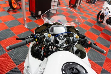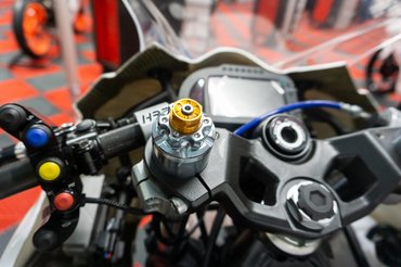 A Ninjákon már fent van a kormányelfordulás-szenzor, amelyet a kormánygátlóra házasítottak rá (szintén utólagos extra), és a blokk körül is sok meló volt, a szekunder légrendszertől a karbonkaniszterig semmit nem hagytak érintetlenül.