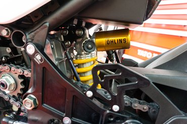 A központi rugóstag Öhlins, ez a legjobb, ami ide megvehető - az olasz Andreanitól rendelték meg, ráadásul úgy, hogy ugyanazokból a komponensekből álljon, mint amit a VB élmenői is használnak. Az Öhlins egyébként ebbe a SSP300-as kategóriába nem árulja a csúcs futóműveit, tehát a lakosságilag megvehető legjobb gátló, a TTX nincs ebben a méretben, csak az eggyel szerényebb, utcai sportváltozat. Ugyanez igaz az első villára is, Ninja 400-hoz nincs FKR cartridge, csak az egyszerűbb FKS - ezért az első futómű belseje nem Öhlins, hanem egy másik, de hasonló rendszerű - felépítésében és méretezésében ugyanaz, némi rosszindulattal nevezhetjük koppintásnak is, annyi a különbség, hogy minden alkatrész le van eloxálva, így kevesebb kopadék képződik, és nem kell olyan sűrűn olajat cserélni benne.
