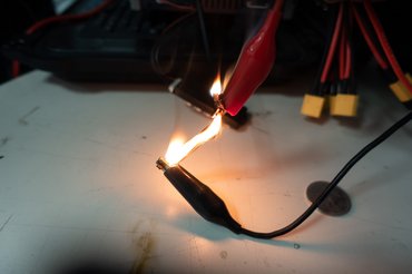 Van még egy veszélye a járműgyártás szempontjából, mégpedig hogy a szénszál vezető, de nem különösebben jó vezető - fémekhez képest nem jó, de annyira nem nagy az ellenállása, hogy megakadályozza az áram folyását (ha nem tudsz követni, itt egy kis segítség). Így melegszik, sőt, ideális gyújtós, hiszen van jó fűtőszál, körülötte pedig ott a remekül égő műgyanta. Meg is néztük, hogy viszonylag szerény áram alatt, 12V-on és 5-6 amper körül milyen szépen izzik, és égeti le magáról a kötőanyagot.