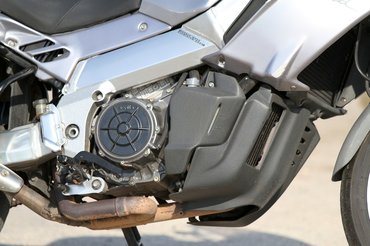 A műszaki alapok a Milléből, a Tuonóból és a Futurából jönnek – a Rotaxtól származó ezres V2-esbe azonban mélyen beletúrtak, hogy a hangolása megfeleljen egy túraenduróhoz. A csúcsteljesítményből jócskán visszavettek, a 128 lóból 98 maradt, az 51 mm-es Denso befecskendezőt pedig 47-es Segamra cserélték. Tohonya így sem lett, sőt, kimondottan sportos a karaktere, a rövidlöketű blokk nem ellenkezik, vígan forog, a csúcsteljesítményt 8300-nál adja le. Háromezer alatt nem is érzi jól magát, olyankor hajlamos rángatni, de utána magára talál, és kellemesen húz.