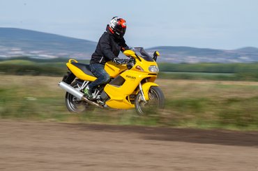 A kormány kellemesen magasan van, bőven a villahíd felett kezdődnek a csutkák. Nem egyenes a hát, mint egy túramotoron, de nem is bikram jóga, mint egy igazi sportmotor. A tank furcsa íve végül nem nyomta a hasamat, de simán el tudom képzelni, hogy a belesebb népek már nem találják otthonosnak. Ez a motor amúgy sem való mindenkinek - nem véletlen, hogy nem lett sláger. Leginkább a mostani lakossági sportmotorokhoz hasonlít, mint amilyen a Honda CBR650R vagy a Ninja 650, annyi különbséggel, hogy ennek minden porcikájában benne van a tűz - nem egy utcai motort pimpeltek fel, hanem egy pályagépet tettek élhetőbbé.