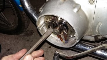 Csak sajnos, az egyik leömlő hűvös maradt, utalva arra, hogy abban a hengerben nincs robbanás. Gyújtásfedél le, látom, az egyik megszakító úgy szikrázik, mintha Karesz hegesztene Merci-padlólemezt az éjszaka közepén. Nézem, a szikrázónál nem 0,4, hanem 0,2, sőt, kicsit talán kisebb is a megszakítóhézag. Ugyanaz volt ott a probléma, amit én magam is előidéztem Bálint motorján, amikor elfelejtettem megolajozni a főtengelyt kenő filcet. A megszakító emelőujját a száraz főtengely bütyke nyomkodta, ettől az elkopott, megnőtt a hézag. Érdekes, ebben a motorban is még gyári az egyik eredeti megszakító, az jó is maradt, csak az utángyártott kopott el. Beállítottam, megkentem, ez így már jó lesz.