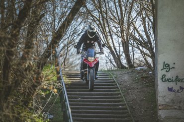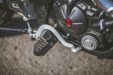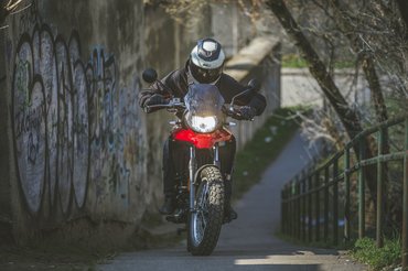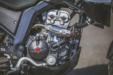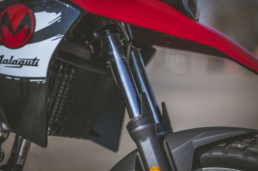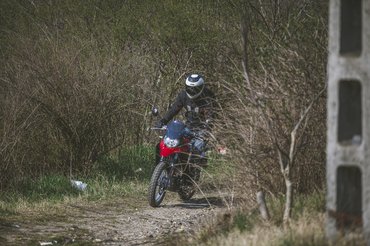 Az ülése nem magasabb, mint egy naked bike-nak, a futóműve viszont hosszabb – 15 centi rugóút azért még távol van az enduróstól, a sportendurók 30 centi körül járnak, a túraendurók 18-20 centinél, tehát ez amolyan funbike futómű. Viszont ha az alja úgy van magasan, hogy a tetejét nem emelik, akkor a kettő között kevés lesz a hely – emiatt van az, hogy bár a lábtartót nem hogy nem vitték sportosan hátra, sőt, igazából a test vonala előtt van, mégis viszonylag hegyes a térdszög. A lábtartók egyébként viszonylag kicsik, állva motorozáshoz szélesebbek jobbak lennének, de ezekből is egy mozdulattal kivehető a gumibetét, és akkor kevésbé csúszkál a saras csizma. A váltó- és a fékpedál alumínium, viszont a féknek a feje annyira kicsi, hogy elsőre alig találtam meg – gyorsan rááll a láb, és utána már nem okoz gondot.