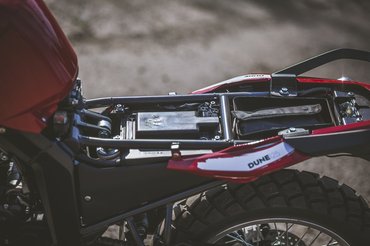A Malaguti kínálatának többi modellje is könnyen beazonosítható: az XTM nem más, mint a Senda, az RST 125-ben a GPR125-öt tisztelhetjük, a Monte Pro 125 pedig nem más, mint a Derbi Mulhacén. A Madison 300 pedig az Aprilia SR Max. A Dune a 2009-ben bemutatott Derbi Terrához képest érdemben nem változott, a Paioli villát egy márkajelzés nélkülire cserélték, a féktárcsa is egy kevésbé csicsás lett, illetve az időközben megszigorított környezetvédelmi normák miatt az idomok alá bekukucskálva felfedezhetünk egy karbonkanisztert. A blokk a Minarellitől származik, és az eredetileg Euro3-as DOHC egyhengeres még Euro5-ösként is tudja a 15 lóerőt 10750-es fordulaton, a végsebessége pedig 115 km/h körül alakul – ez a hivatalos adat, de az óra szerint megy többet is.