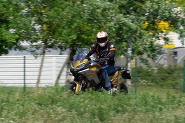 Az XR-nek lehet kenni rendesen, a karcsú motoron jól lehet mozogni, a széles kormánnyal pedig könnyű becélozni a kanyarkijáratot. A futóművel sok dolgod nincs: a 43 mm-es első villa nem állítható, a központi rugóstagot pedig tekergeti helyetted az elektronika, elég a menüben kiválasztani, hogy egyedül vagy utassal mész, és hozzáigazítja a terheléshez az előfeszítést, a csillapítás karakterét pedig az üzemmódhoz választja - lényegében mindegy, hogy Dynamic vagy Road beállítással mész, ez mindenhogy feszes, jó úton élménydús, rossz aszfalton pedig hajlamos rázni és pattogni. Ki lehetne hozni ebből sokkal többet is, de a tökéletességet meghagyták a kilós XR-nek.