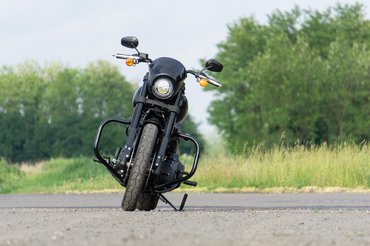 Az üléspozíción kívül a futómű sem volt partner a nagy merengésekben, a hagyományos értelemben vett cruisoláshoz ez feszes. Rossznak véletlenül sem nevezném, a 43 mm-es, cartridge-es fordított Showa villa várakozáson felül jól dolgozik, a központi rugóstaggal sem volt gondom, de a hangolásnál a sokszámjegyű utak állapotát nem vették figyelembe. Cserébe ha jó az út, rendesen be lehet támasztani a kanyarba, és a magasan lévő lábtartókkal cruiser szinten igen jól lehet támadni az ívet, összesen 33 fokos dőlésszöget enged - pályamotorosok egyenesben is mélyebbre döntenek, cruisernél viszont ez annyira nem is rossz. Ja, és szintén sportos vonal, hogy a felhajló lábtartót rugó húzza vissza.