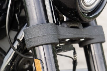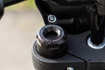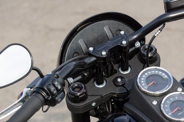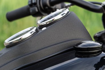 Az összhatás tehát kiadja, a részletekkel viszont nem mindehol értek egyet. A Harley-nál külön részleg foglalkozik új felületek és fényezések kutatásával, biztosan el is végzik a rájuk bízott munkát, mert rendre elő is állnak valami újdonsággal. Nagy kedvencem volt a hard candy, amikor extra nagy metálszemcsék voltak a festékben, de emlékezhettek még a matt króm korszakára is, sőt, a Road Glide csodálatos feketéje sem volt véletlen. Valószínűleg nem a Low Rideren debütált, de én itt találkoztam először ezzel az érdes fekete bevonattal, ami a műszerek köré és a villahidakra jutott. Értem, mire gondolt a művész, de meg kellett kopogtatnom, tényleg fém-e, és véletlenül nem valami poliuretán. Ráadásul van ugyanilyen külsejű betét valóban műanyagból a fejidom mögött.