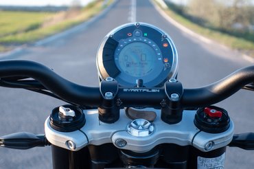 Azért csíkot gázzal is lehet húzni, a kipörgésgátlót a műszerfalon lévő jelzés nélküli gombbal lehet deaktiválni. Itt a Duke-kal ellentétben nincsenek konfigurálható menetmódok, a nehezen olvasható monokróm műszerfalon amúgy sem lehetne normálisan állítgatni őket. Ez igazából pozitívum, a motor varázsát igazából pont a nyers funkcionalitás és könnyedség adja.