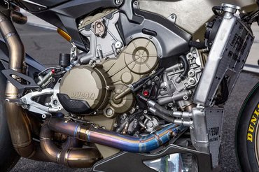 A 1198 köbcentis Superquadro blokk 200 lóereje nem igényelt további hergelést, csak egy módosított Akrapovic kipufogó került fel, amely kicsit úgy néz ki, mintha egy nagy piton éppen próbálná megfojtani a motort - annyi különbséggel, hogy ennek a funkciója pont az ellenkezője a megfojtásnak.