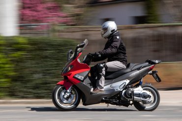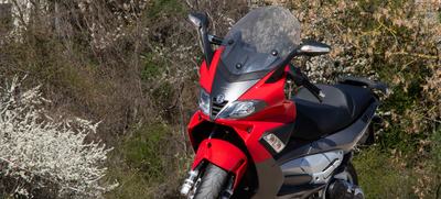 Kicsit megszívta a nap és az öt év állás sem a szépségéért dolgozott, de még így is mutat, az olasz formatervezők odatették magukat. Nem olyan aránytalanul nagy a feje, mint a legtöbb óriásrobogónak, a hátulját pedig sportmotorosan felhúzták. Ez közrejátszhat abban, hogy az ülés elég magasan van, 178 centimmel éppen csak lebegett a talpam a föld felett.