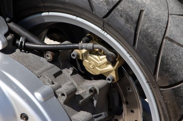 Mindenhol Brembo Serie Oro nyergek fogják a tárcsákat, tehát nem spóroltak a fékrendszeren, viszont rosszul adagolható. A hátsó fék (és ezzel együtt a bal első tárcsa a kombinált fékrendszer miatt) a kar húzására sokáig csak lassított, aztán a végefelé hirtelen berántja a rendszert. Ez még megszokható volt, de az első fék ezt még agresszívebben csinálta, ráadásul az már a fékút első negyedénél rántott. Poros talajon forgolódva majdnem kiesett alólam a motor.