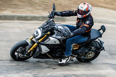 Ez az S változat, csúcs futóművel és fékkel - a minden irányba állítható Öhlins-ekről, a titán-nitrid bevonatú becsúszószárakról és a Brembo M50-es versenyfékekről messziről felismerni, de a teljesen ledes fényszóró, a mart felnik és az ülés is árulkodó részletek. Ehhez már szériában jár a kétirányú gyorsváltó, amelynek terjedése a modern motoripar legszimpatikusabb húzása - aki még nem próbálta, az méltatlankodhat, de akkor tessék az irányjelzéshez is a kezeket használni, nem holmi gombot nyomogatni. A normálisak pedig élvezzék a gyorsváltót, amikor nyélgáznál elég csak a csizma orrával pöccinteni egyet, és megszakítás nélkül folytatni a gyorsítást, vagy amikor a kanyar előtt féktávon elég kettőt taposni, és tökéletesen simán lehet rátámaszkodni az ívre. És ez most nem ilyen elméleti fejtegetés, a Diavel S-sel könnyen ki lehet meríteni a bökős menés fogalmát, és nem csak a hosszú íveken, megelőlegezem neki, hogy egy Kakucs jellegű csikicsuki pályán is lehet vele értelmezhető kört menni.