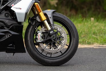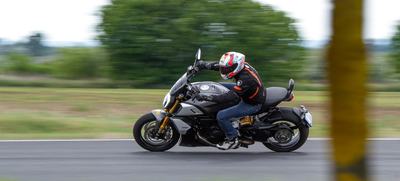 Nem hiszem, hogy az alapváltozat Brembo M4.32 fékeivel bármi gond lenne, de a versenycuccok minden motornak jól állnak. Nem lepett meg, hogy az M50-es nyergek ezzel a radiális főfékhengerrel brutálisan fognak, a Brembo kínálatában ennél feljebb csak a Stylema van, amit pl. a Panigale V4-re is szerelnek. Nincs kezdeti heves harapás, egyszerűen csak tökéletesen adagolható, és tisztán közvetíti, mennyi még benne a tartalék és hogy állunk a tapadással, miközben olyat lassul, mint egy kilós sportmotor.