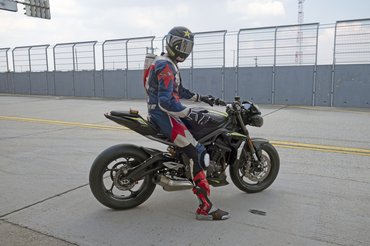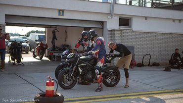 A csapatunk összeállítása természetesen nem volt véletlen. Minimum kettő, maximum három versenyzőt indulhat az endurance-on saját motorjával, a cseréknél az időmérő transzpondert kell a soron következő motorra áthelyezni. Ádám a jóga mellett pályamotorozást oktat, a Triumph Budapest színeiben érkező Varga Zoli pedig néhány éve még a magyar bajnokságban húzta a gázt. Így három egyforma Street Triple-lel indultunk a „Street” kategóriában. A csapatunk nevét ki nem találnátok: Triplák!