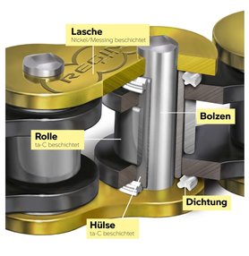 A M Endurance lánc hagyományos X-gyűrűs tömítést használ, hogy a kenőanyag bennmaradjon a görgők és a csapok között, a trükk tehát nem itt van, hanem a perselyek és a görgők bevonatában - amely egyfajta DLC (teljes nevén Tetra Amorphous Carbon, röviden ta-C). Rendkívül kemény és kopásálló, eddig leginkább csúcskategóriás futóművekben és motorok belső részein találkozhattunk vele, például a Honda CBR1000RR-R-nél már nagy mennyiségben alkalmazzák.