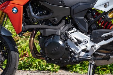 Az F 900 R ugyanazzal a sorkettes, 270/450 fokos elékelésű, vizes blokkal működik, mint az XR – ez amúgy a kínai Loncinnál már 2007 óta készülő kéthengeres legutolsó inkarnációja. Nem egy szép blokk – a vizes sorkettesek nehezen tudnak azok lenni -, de rossznak senki nem mondja, sem a megbízhatóságát, sem a finomságát tekintve. Hogy a motor csúnyaságát eldugja szem elől, a BMW az egészet telibe festi feketére, mint tanyasi simsonos, amikor kap három doboz ingyen Prevent mattfeketét. De a szintén fekete (viszont szép vonalú) vázban megbújva így már nem zavarja a szemet.