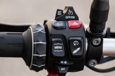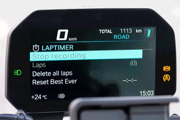 A panel a bal kéznél levő üzemmódválasztóval átváltható rendes, mutatós, kerek fordulatszámmérősre, ilyenkor pedig kétoldalt a gyorsulásmérő és a dőlésmérő is játékba lép, de van köridő-mérő funkció, jármű-diagnosztika és természetesen mindenre kiterjedő fedélzeti számítógépes adatszolgáltatás is. Ha pedig valaki rá tudja cuppantani a BMW-navigáció alapkészülékét is a kormányon levő, előkészített tartókonzolra, akkor a térképet is ezen a nagy, és tényleg alig-alig tükröző kijelzőn jeleníti meg a motor. A készüléket nem tudtam megszerezni a tesztre, tehát nem tudom, hogy néz ki a képe.