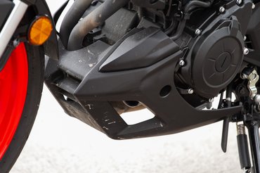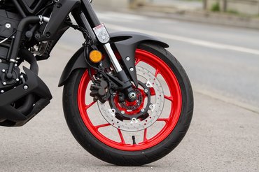 Újdonság a 37 mm belsőcső-átmérőjű KYB fordított villa, de hiába a feszesebb (de az R3-nál azért lágyabb) hangolás, bizonyos szempontból visszalépés, hiszen az előző generáció hagyományos felépítésű telója 41 mm-es volt. És nem is védhető a helyzet azzal, hogy az USD villa annyival merevebb, hogy kisebb átmérővel is ugyanazt tudja, hiszen a 15 lóerős MT-125-öt valamiért 41-es fordított villával kínálják.