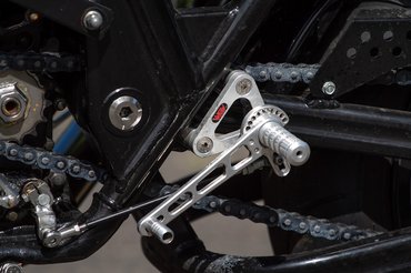 A gyári lábtartót is elengedték - és most van itt egy kis nyelvi akadály, mert szívesen írnám, hogy a helyére egy ABM állítható versenylábtartó került, csak nem lenne igaz, mert nem a gyári helyére került, hanem annál lényegesen hátrább és magasabbra, de olyannyira, hogy az utaslábtartót fel is kellett számolni, mert így már a motor kétfős használhatósága veszélybe került. Mivel eredetileg az utas lábtartójának a konzolja fogta a kipufogót, ott is szükség volt egy új tartóra, amely a motor egészéhez hasonlóan szépen kivitelezett darab. A ZRX kategóriáját szokás big bike-nak hívni, de ez kizárólag a köbcentire igaz, egyébként apró motor, a módosított üléspozícióval pedig még kompaktabbnak érezni.