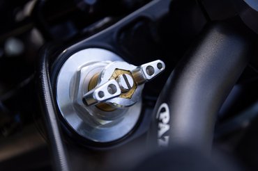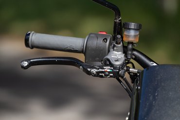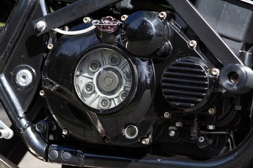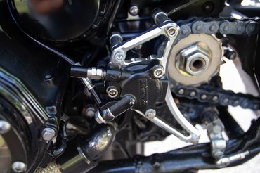 A plexivel átlátszóvá varázsolt deklik jópofák, és leszámoltak az első lánckereket takaró műanyaggal is - ez újabb feladatot adott az építőnek, így ugyanis kellett egy új konzol a hidraulikus kuplung munkahengerének. Ezt egy nagyon szép mart darabbal oldották meg, és ha már a kuplung környékén volt dolguk, a főhengert a fékhez passzoló, radiális, állítható áttételű Brembo RCS 16-ra cserélték. Sehol nem végeztek fél munkát.