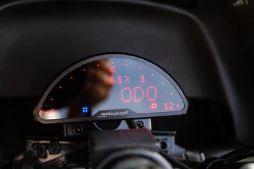 A gyári órák helyére egy digitális Motogadget egység került, aminek a léptetőgomját kivezették a bal kézhez. A műszerfal szépen belesimul a környezetbe, mögötte sem a kuszaságot látni, hanem egy takaróelem teszi tisztává az összképet. Nincsenek bántó részletek, kikandikáló igénytelenség, de azért tervbe van véve, hogy minden vezeték behúzva fusson.