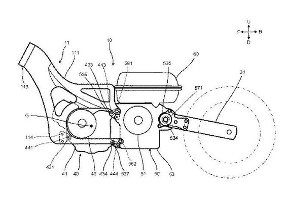 A szabadalom nem a hajtás sajátosságaival foglalkozik, hanem a váz elrendezésével, hogy mi hova kerül, illetve mi az, ami teherviselő elemként szolgál. A konstrukció sok részletében emlékeztet a TMAX felépítésére.