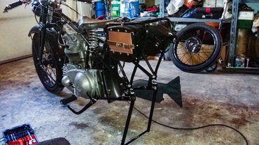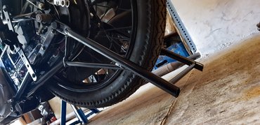 Tehát legalább újra sztenderen állt a motor, ráadásul masszív sztenderen, igaz, a váz aszimmetriája miatt az egyik feltámaszkodó szár alá gumiból távtartót kellett gyártanom. Ja, és a váz elméretezése miatt ezt az újat is rommá kellett köszörülnöm, de itt szerencsére a támasztékok tartanak, nem tőben a vázcső végének támaszkodó vascső. Mondom, sokkal korrektebb.