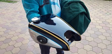 Végül kaptam egy telefont Bálint Jóskához, aki sok tankot megvonalazott már, elmentem hozzá, 12 pénzből gyönyörű, kézzel festett csíkozásom lett az NSU-tankon. Sokkal jobban örülök ennek, mint valami matricás tökéletességnek, amilyen a német csúcsrestaurált gépeken van, hiszen a nénék a gyárban 1938-ban ugyanígy, kézzel húzták az aranyat a tankra Neckasulmban. Szerintem tök hiteles, de ha valaki szerint nem az, leszarom. Tetszik.
