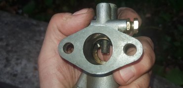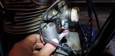 Szóval a karbi. Egyetlen klasszik, kétfüles, igazán NSU-ra való példányom volt. A másik három viszont ugyanaz a típus, de csőcsonkra szorítós fajta. Szerencsére Miki előttem már odáig eljutott, hogy a motor nem igazán akar működni a saját Graetzinjével, ezért egy Pannónia-féle Jikov-karbihoz készített egy kétfüles, felcsavarozható csőcsonkot.