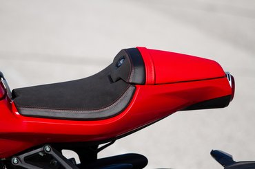 A veretést nem csak az addiktív blokk támogatja, a periféria is teszi alád a lovat. A felső polcos Brembo fék nyilván nem szorul magyarázatra, viszont ezen az árszinten párosíthattak volna finomabban reagáló Öhlins hátsó gátlót is a Marzocchi teleszkópszárakhoz. Feszesnek feszes a hátulja, csak kissé sprődnek tűnik. A geometria ellenben egészen zseniális elegyét alkotja a fordulékonyságnak és a stabilitásnak. És most nyert igazán értelmet a fejemben Talma jótanácsa: minél keményebb az ülés, annál jobban közvetíti a motor minden rezdülését. Márpedig itt egy szinte versenymotorosan kemény szivacs van alattad.