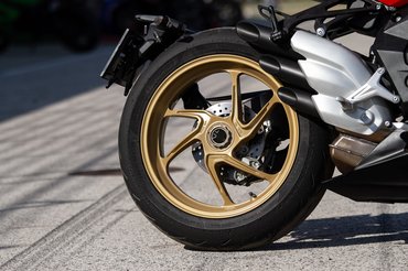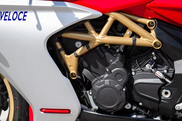 A bevonulás közben szinte éreztem magamon azokat a becsmérlő pillantásokat, amiket a nagyon csili-vili motorok tulajdonosai szoktak kapni egy pályanapon. Mert valljuk be, a Superveloce akkor is inkább életstílus-kiegészítő, ha történetesen lehet vele gyorsan menni. Már pedig lehet. Sőt, kívánja, hogy rendesen elkenjed a száját! A megnövelt löket ellenére ez egy alapvetően hegyes blokk maradt, viszonylag hosszúra áttételezve. Különlegessége, hogy a főtengelye hátrafelé forog: ez megoldás az egykerekezési hajlamot hivatott csökkenteni.