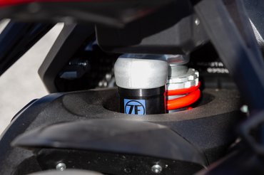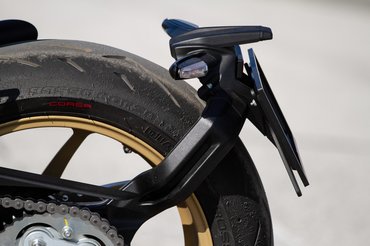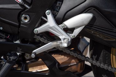 De éppen azért, mert egy telivér sportmotor, nem is vérszegény. Olyan élet van benne, amit az emissziós okokból rendkívül hosszú végáttétel sem vert agyon, de ha veszel egyet, a kisebb első lánckerék legyen az első dolgod. Minden más egyébként kész van rajta, nem kell semmit befejezni. A futómű utcán zseniális sportfutómű, a kátyúkat természetesen kerülgeted, a fék pedig egyenesen fenomenális. Eleve úgy ülsz rajta, hogy a testsúlyod nagyobb része az első kereket terheli, a két dupla tárcsa pedig a radiális főhengerrel olyat mar még 180-nál is, hogy rendesen kell szorítanod a tankot, hogy át ne repülj a kormány felett. És mindenén azt érezni, hogy versenypályán él igazán.