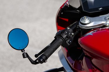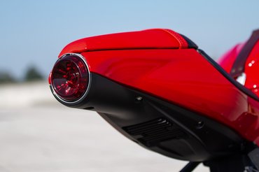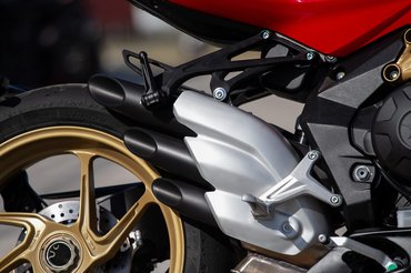 Az oldalt kivezetett három kipufogóvég, az egykarú lengővillához csatlakozó meseszép felni és a pompás térhálós váz pedig a retro-formavilág iránt kevésbé fogékonyakból is előcsal egy halk aztakurvát. Viszont a tankon elhelyezett, funkció nélküli bőrszíjat legfeljebb egy épített café raceren tudnám elképzelni, ezzel a giccsel szerintem már átestek a túlsó ló másik oldalára. Illetve a plexin levő spoilert tartom még határesetnek, azóta sem tudom eldönteni, tetszik-e vagy sem. Egy biztos: a forma még az egzotikumnak számító MV-k között is horzsol.