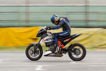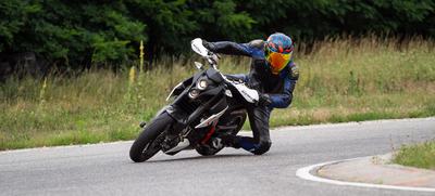 Ettől még nem érdemes hatodikban sokáig nyelezni, ez a motor kanyarodásra van kitalálva. Bár az üléspozíció elsőre abszolút szupermotósnak tűnik, menet közben valahogy mégis nehezen találtam a helyemet rajta. Ezt Szabi, az itt szereplő példány gazdája is megerősítette. Ő is csak viszonylag hosszú idő után érzett rá, akkor viszont nagyon. Mellesleg tényleg arra használja, amire való: M5-ös pályamotornak (Kecskemét-Örkény-Kakucs). A károk minimalizálása érdekében leszerelt róla minden felesleges kacatot (tükrök, indexek, rendszámtartó konzol), és felszerelt pár (tengelyvég-gombák, kézvédő). A Hungaroringen már kínos lenne végig gubbasztani rajta a célegyenest, de a szűkebb pályákon megfelelő pilótával bármilyen nagy sportmotornak ki lehet vele fújni az orrát.