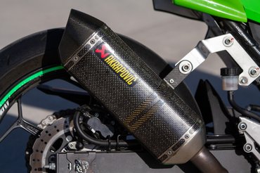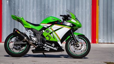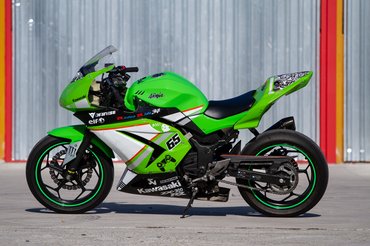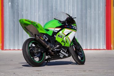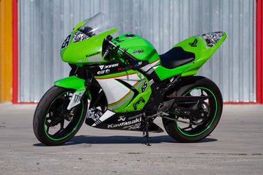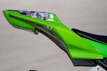 Én azonban mégis inkább japánt vadásztam, így esett a választásom a pályára átalakított Ninja 300-ra. Azért nem építettet írok, mert ezt nem egy versenycsapat készítette fel valamelyik nemzeti bajnokságra, hanem egy német proktológus vette a fiának. Azonban egy ZX-6R már a kis Ninja mellett állt a garázsban, mikor meghirdették 4500 euróért, természetesen az összes gyári tartozékával együtt. Az éles szeműek rögtön észrevehetik, hogy furcsán áll rajta a kabát. Mivel az átalakítás idején még nem állt rendelkezésre 300-asra való üvegszálas idom, ezért a kettőötvenesét alakították rá. Ehhez mondjuk szükség volt néhány kevésbé míves hajlított lemezre, de az igényesnek mondható dekorral együtt egészen vállalhatóan fest a gép.