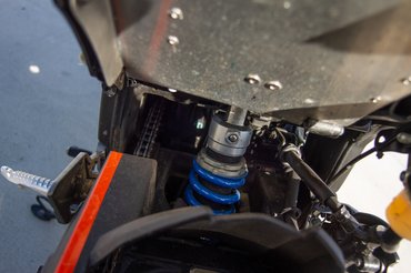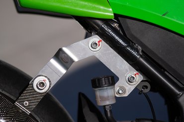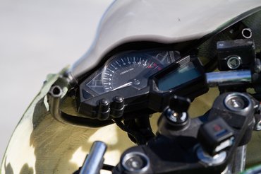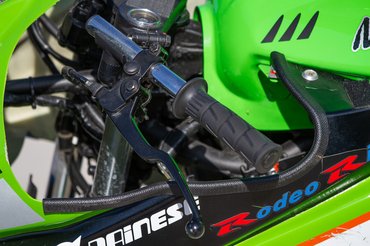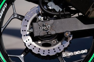 A következő átalakítás a fék: egy verseny fékbetét és a fémfonatos fékcső már akkora javulást hoz fékhatásban, hogy erősebb féktávon már szinte eltekeri a vékony villaszárakat. A hardcore arcok persze egy konzollal ráépíthetik valamelyik random sportmotor négydugattyús nyergét nagyobb féktárcsával. De a legfontosabb a gyári ABS kiberhelése, ami legalább 3-4 kilóval csökkenti a saját tömeget is. A verseny-lábtartó nemcsak az állíthatósága miatt fontos, hanem mivel nem hajlik fel, egy csúszás esetén a motor azon fog csúszni, némi helyet hagyva az alá szorult lábnak.