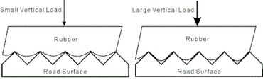 A gumik alapvetően érzékenyek a függőleges irányú erők nagyságára. A fenti gondolatmenet alapján logikus lenne, hogy minél nagyobb erő terheli a gumikat függőlegesen, annál jobban fog terülni és annál nagyobb lesz a tapadás. Sajnos ez nem igaz, mert a gumikra vonatkozó „függőleges terhelő erő - tapadási erő” kapcsolatnak minden esetben van maximum értéke, vagyis a terhelést tovább növelve nem nő tovább a létrehozható tapadási felület, és így a tapadási erő.