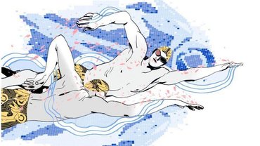 Úszónadrágokon jelenik meg a nagyrobogó Gianluca Foli rajzán. Ő egy gyorsúszó párharcot örökített meg. Japánra utaló motívumként visszaköszönnek a rózsaszín cseresznyevirágok.