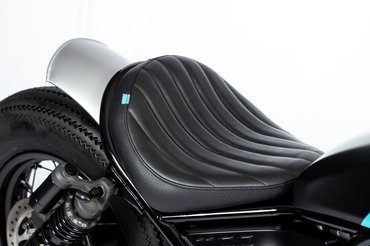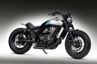A másik gép a CMX Bobber, amelyen átalakították a villa rögzítését, így két és fél centivel lejjebb került a motor eleje. Hátul maradt a gyári futómű, a fekete, küllős kerekek ellenben egyediek, ballonos Bridgestone gumikat kaptak.