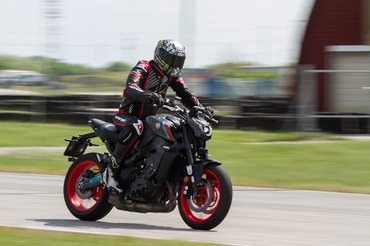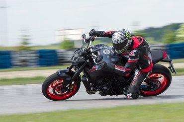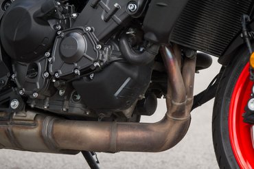 Szóval úgy tűnik, az R1 versenytechnikája leszivárogni látszik a mindennapokba. Bár az SP változat lenne igazából pályára való, abból idén még a vásárlóknak is alig jut, nemhogy az újságíróknak. Mivel az alapverzión is rendes sportabroncsok (Bridgestone S22) feszülnek, különösebb lelkiismeret-furdalás nélkül vittük ki az alap MT-t az Euroringre. Az már az utcán kiderült, hogy a 43 köbcentivel öblösebb blokk nemcsak erősebb, de finomabb járású is lett egyszerre. A szemre káros kipufogórendszer pedig az Euro 5 ellenére is sokkal jobban a szól a réginél. Sőt, kifejezetten kellemes, telt hangja van. Ezért kétszer is meggondolnám, kiadnék-e 818 ezer forintot a gyári Akrapovic rendszerre. Nem, nem elírás – hogy a márkánál maradjak, nyolc kilóért nemrég még jó állapotban lévő Fazert lehetett venni. Hagyjuk is... Egyesbe be, kuplungot ki, hinnye, milyen jól tol már lentről! És milyen szépen veszi a fokozatokat, lefelé is. Bizony ez a motor most ért össze harmonikus kerek egésszé. Kigyomlálták belőle az elődmodell ideges gázreakcióját, de finom aláfestéssel továbbra is képes másodikban bármilyen fordulatról könnyedén levegőbe emelni az első kereket. Kilencvenhárom newtonméter bizony nem kevés, és ezt a kövér nyomatékot 8500-as fordulat helyett már 7000-en leadja. És sokkal jobban esik elforgatni, mint a régit – még ha nem is olyan vadul harapja a fordulatot, mint egy Street Triple 765. A Yamaha blokkja kisebb literteljesítményű, alacsonyabb fordulatra és sebességtartományra van hangolva. Ez tükröződik a végsebességben is: bár óra szerint megfutja a 230-at, hatodikban továbbra is le van korlátozva.