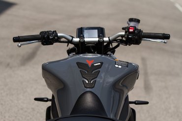 Harmonikusabb karaktere ellenére továbbra sem lett a szende szüzek motorja a 09-es. Bár mélyen elítélem a virtuskodást, egyik barátom kifejezetten azért választotta a típust, mert ezzel lehet a legjobban egykerekezni. A picivel erősebb 21-es modell pedig még alkalmasabb a zavarkeltésre. De hogy a praktikus oldalát is említsem, meglepően sokféle kiegészítővel lehet mindennapi ingázásra alkalmassá varázsolni. Gyári topcase-t például nem sok csupaszhoz lehet rendelni, és a nagyobbik plexi is egészen hasznosnak tűnik. A Gilles Tooling gyártmányú állítható lábtartószett mellett még kifejezetten érdekes a minden irányban állítható kormánykiemelő: ezekkel tényleg teljesen személyre tudod szabni a motort.