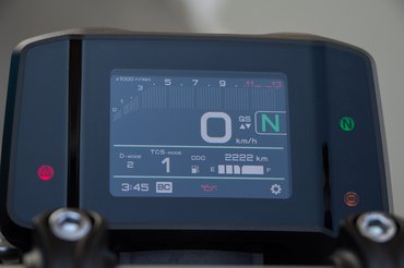 Az apró színes kijelzős műszerfal komoly újításokat sejtet. Jelentem, az MT-09 elektronikai arzenálja nemhogy felzárkózott, némileg meg is haladja az európai konkurensek tudását. A fel-le gyorsváltó már eggyel lejjebb is magától értetődő extra, a dőlésszög-érzékeny blokkolás- és kipörgésgátló sem nagy truváj, de a „Slide Control System” feliratú menüpont láttán elhagyta a számat egy visszafogott 'aztakurva! Ettől még persze nem fog magától vastag fekete csíkokat húzni kigyorsításkor a motor, de sokkal jobban a stílusodhoz tudod szabni a motor viselkedését, a hattengelyes IMU miatt kevésbé hirtelen fog beavatkozni az elektronika. Egyedül a Bluetooth-kapcsolat hiányzik a repertoárból, de szerintem emiatt senki nem fog a konkurenciához menekülni.