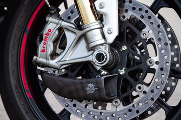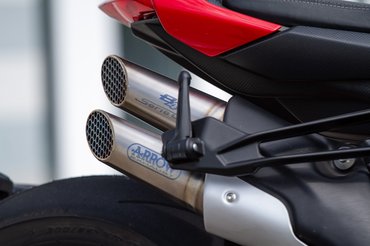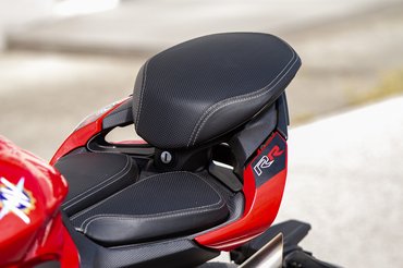 Visszatérve az aktuális harmadik generációhoz, ez szintén háromszáz darabra limitálva látta meg napvilágot. Viszont a Serie Oróról gyakorlatilag csak a titán csavarokat és karbon felniket hagyták el, a fullos elektronikus futómű is maradt a RR-en, az Arrow kipufogórendszert pedig gyári kiegészítőként lehet felpattintani. Kevés ilyen részletgazdag kétkerekűt tudnék felsorolni, egyes alkatrészeit magukban is múzeumban lehetne mutogatni. Az Adrian Morton által jegyzett formaterv különösen agresszív, a többrészes első sárvédőtől kezdve a lapított fényszórón át a valós leszorító erőt generáló oldalsó szárnyakig minden eleme zseniális.