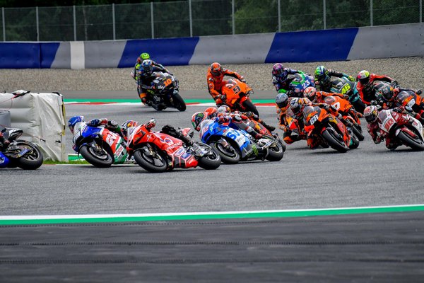 Az osztrák pályán egyrészt a papírforma teljesült, másrészt voltak megdöbbentő jelenetek. A vasárnapra jósolt eső megkeverte a kártyákat, de a királykategória végül száraz versenyként rajtolt el. A tavalyi évhez hasonlóan ismét egy piros zászló borzolta a kedélyeket, a rajt után nem sokkal Dani Pedrosa - aki 995 nappal a visszavonulása után ismét versenyzett – bukott, Lorenzo Savadori pedig a földön fekvő motorjába hajtott. Az ütközés után Apriliája lángra kapott, így ismét apokaliptikus látvány tárult a közönség elé. Szerencsére mindenki megúszta komolyabb sérülés nélkül, bár Savadori az új rajthoz már nem állt fel.